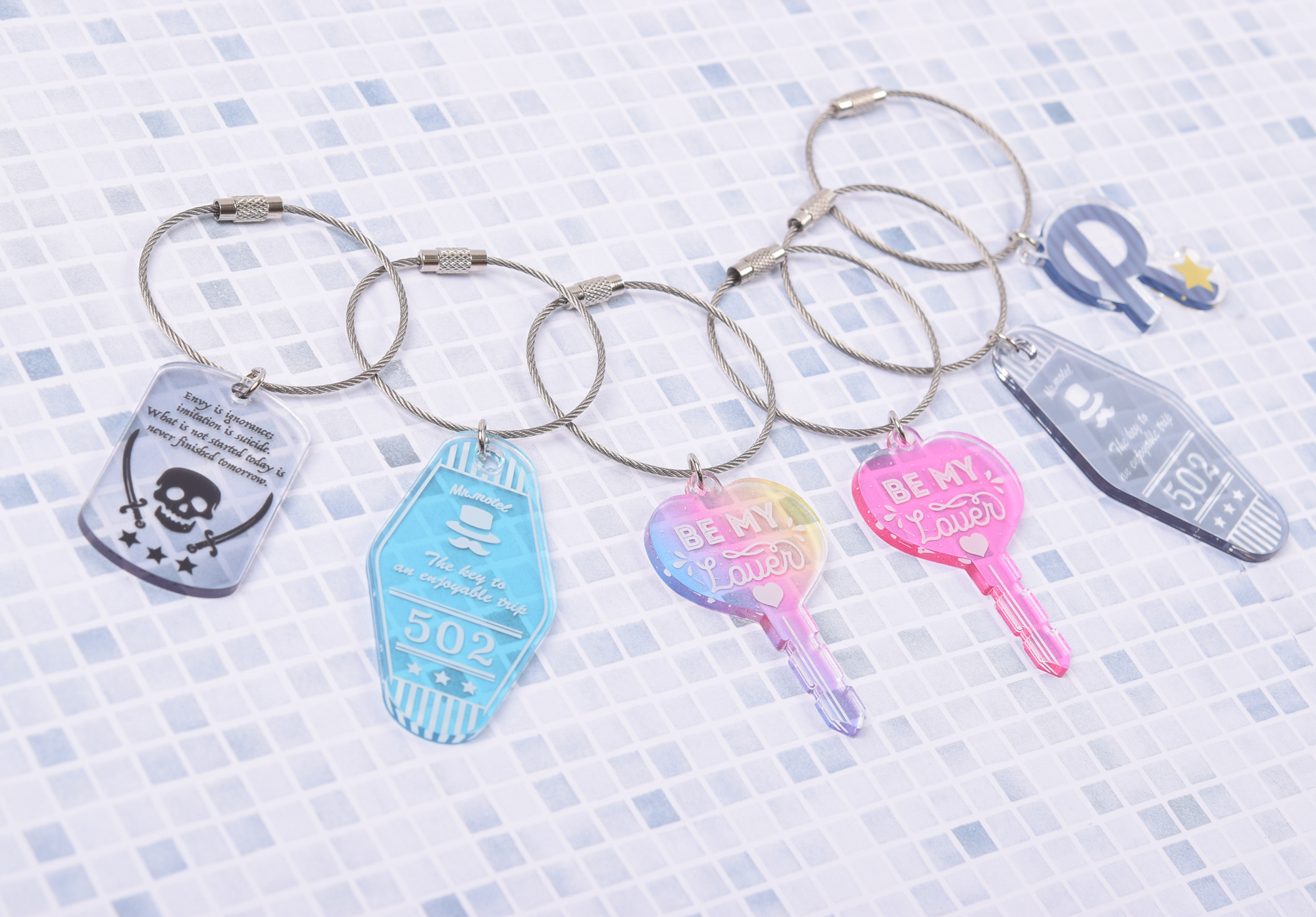 ご注文例:5種デザイン×各20個 合計100個のご注文の場合、合計100個の単価が適用されます。 キーホルダーパーツはワイヤーパーツとなっております。